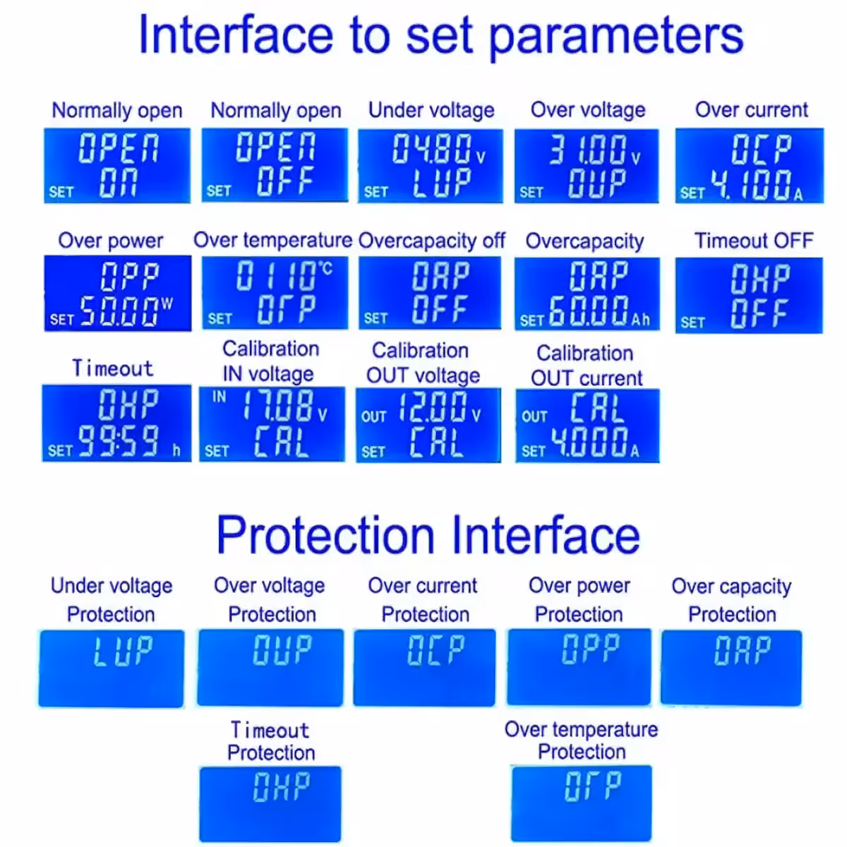 - Postavljanje zaštita i pragova: Dugim pritiskom na U/I uđite u izbornik parametara zaštite. Koristite SW za odabir željene zaštite: LUP (prenizak napon), OUP (previsok napon), OCP (prevelika struja), OPP (prevelika snaga), OAP (prevelik kapacitet), OHP (prekoračenje vremena), OTP (previsoka temperatura). Podesite pragove i aktivirajte/deaktivirajte zaštite po potrebi.