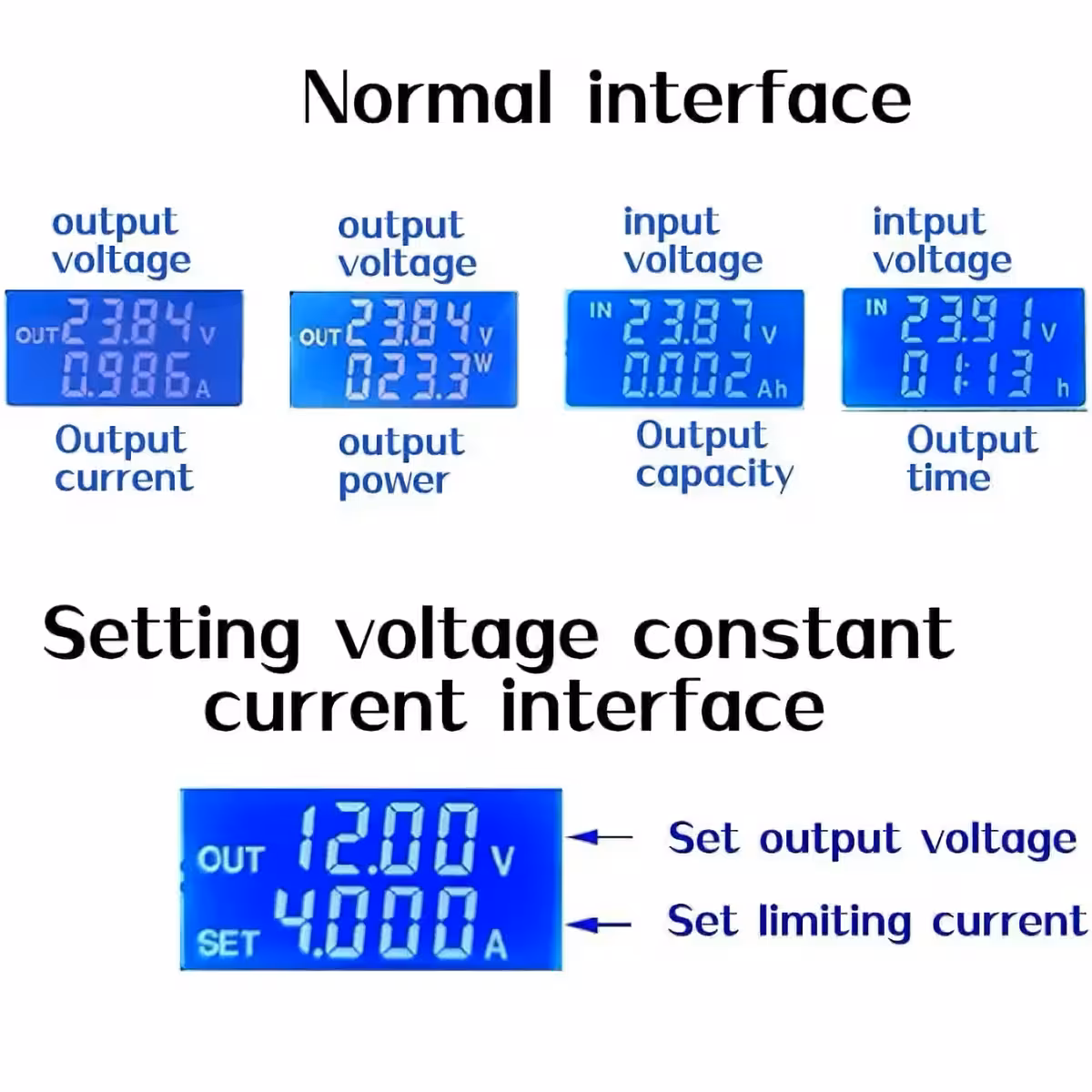 - Prebacivanje prikaza parametara: U normalnom modu, pritisnite gumb SW za izmjenu prikaza između napona (V), struje (A), snage (W), kapaciteta (Ah) i vremena (h). Dugim pritiskom na SW mijenjate prikaz između ulaznog napona (IN) i izlaznog (OUT).
