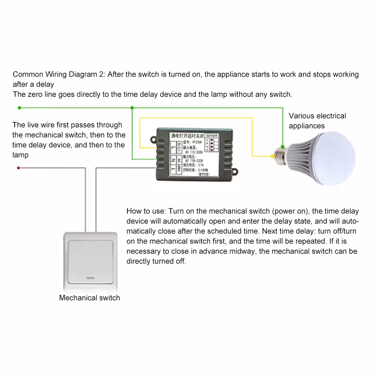 Ovaj mekani/analogni modul vremenskog releja omogućuje odgodu pri uključivanju i kašnjenje pri isključivanju (OFF-delay) s podesivim intervalom od 1–480 minuta. Idealan je za kućne i industrijske primjene, kompatibilan s AC 220V i maksimalnom strujom od 7A. Modul je kompaktan, energetski učinkovit i jednostavan za instalaciju.