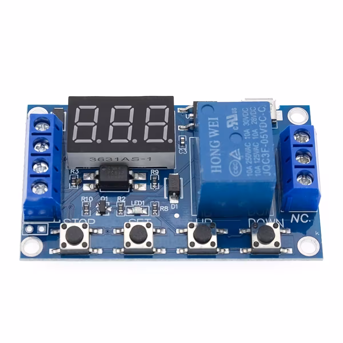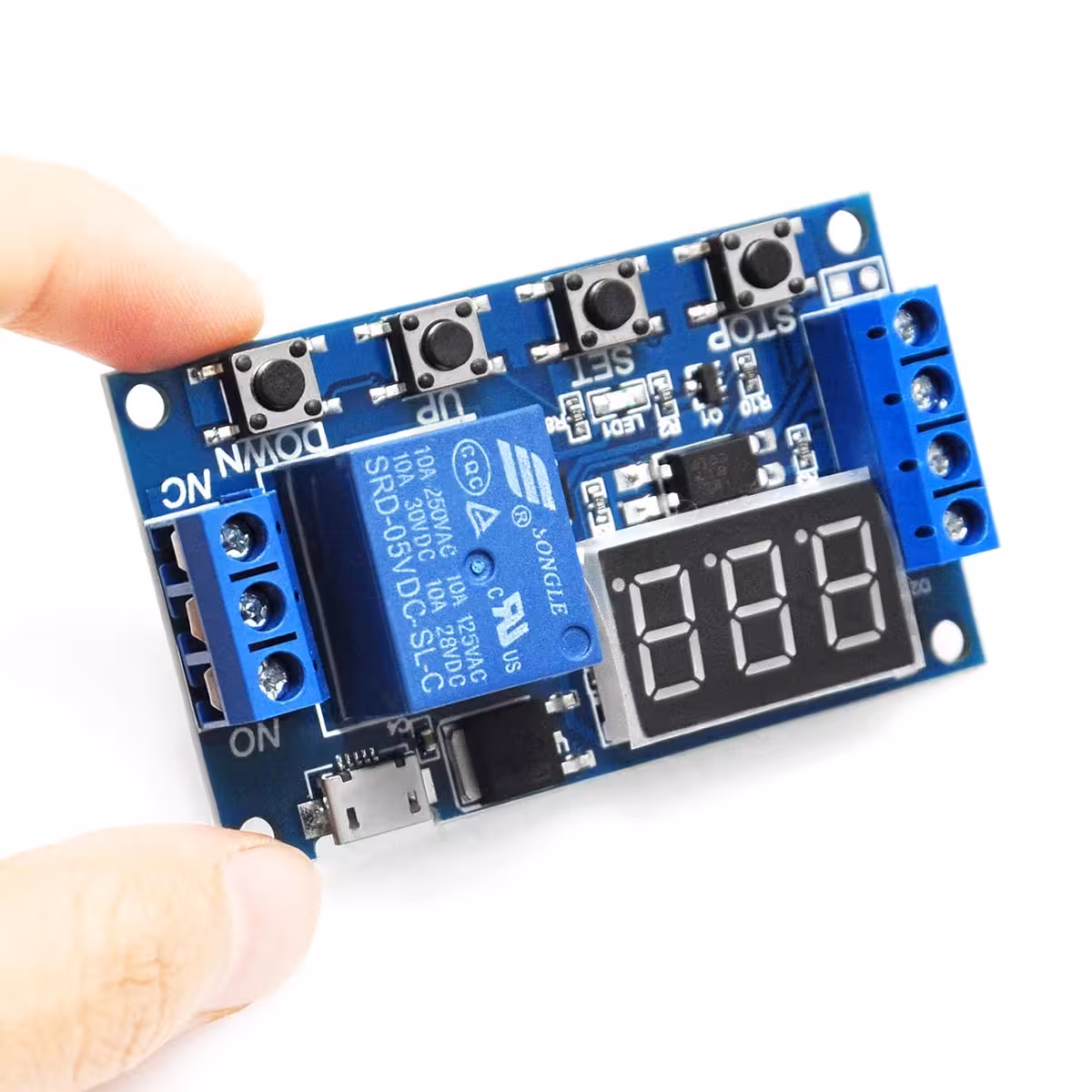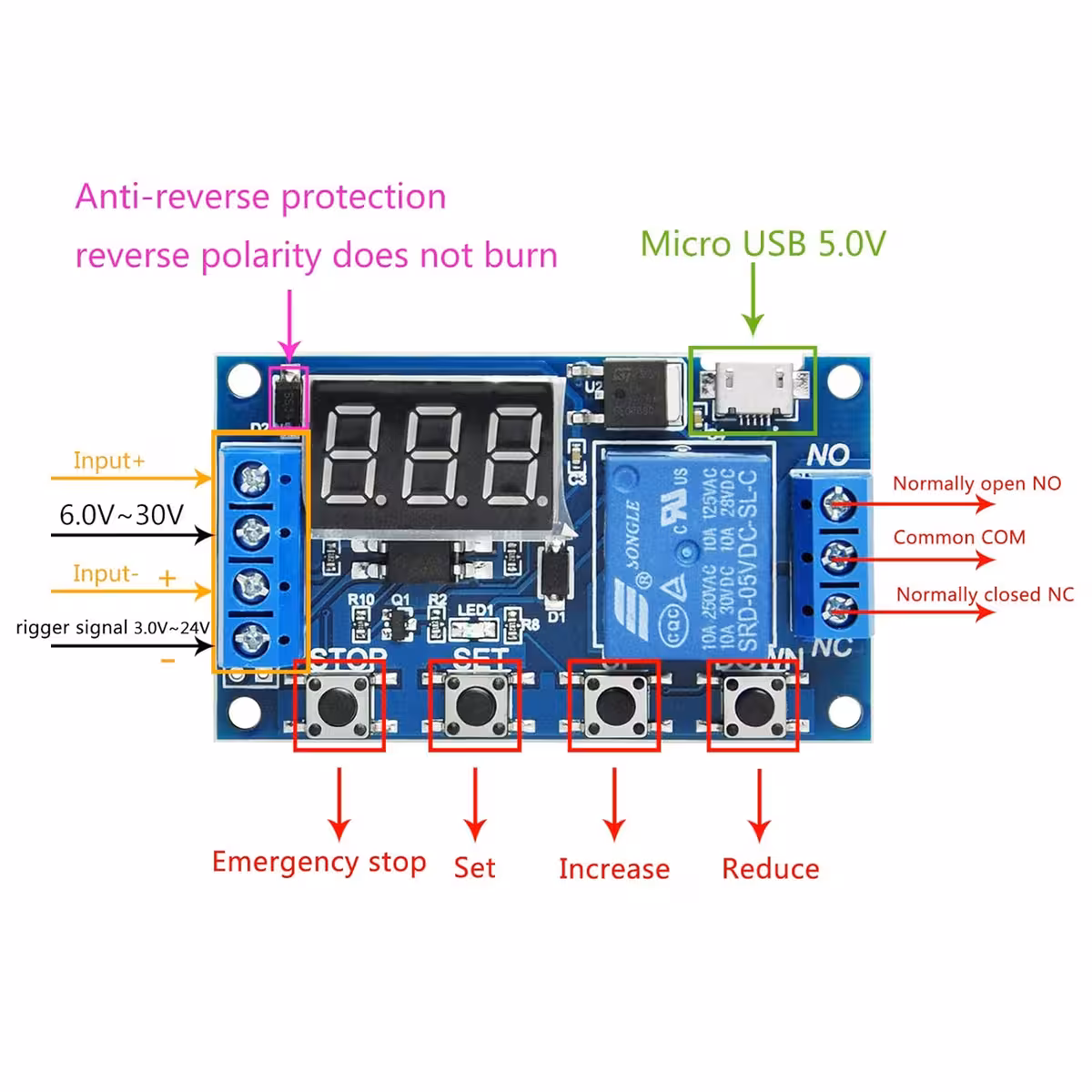 Relej modul s odgodom i podesivim vremenom, kompatibilan s 6–30V (napajanje putem MicroUSB 5V također moguće). Idealan za industrijske i DIY aplikacije koje zahtijevaju relej modul s odgodom, upravljanje i podesivo vrijeme, s digitalnim zaslonom i zaštitom od smetnji.