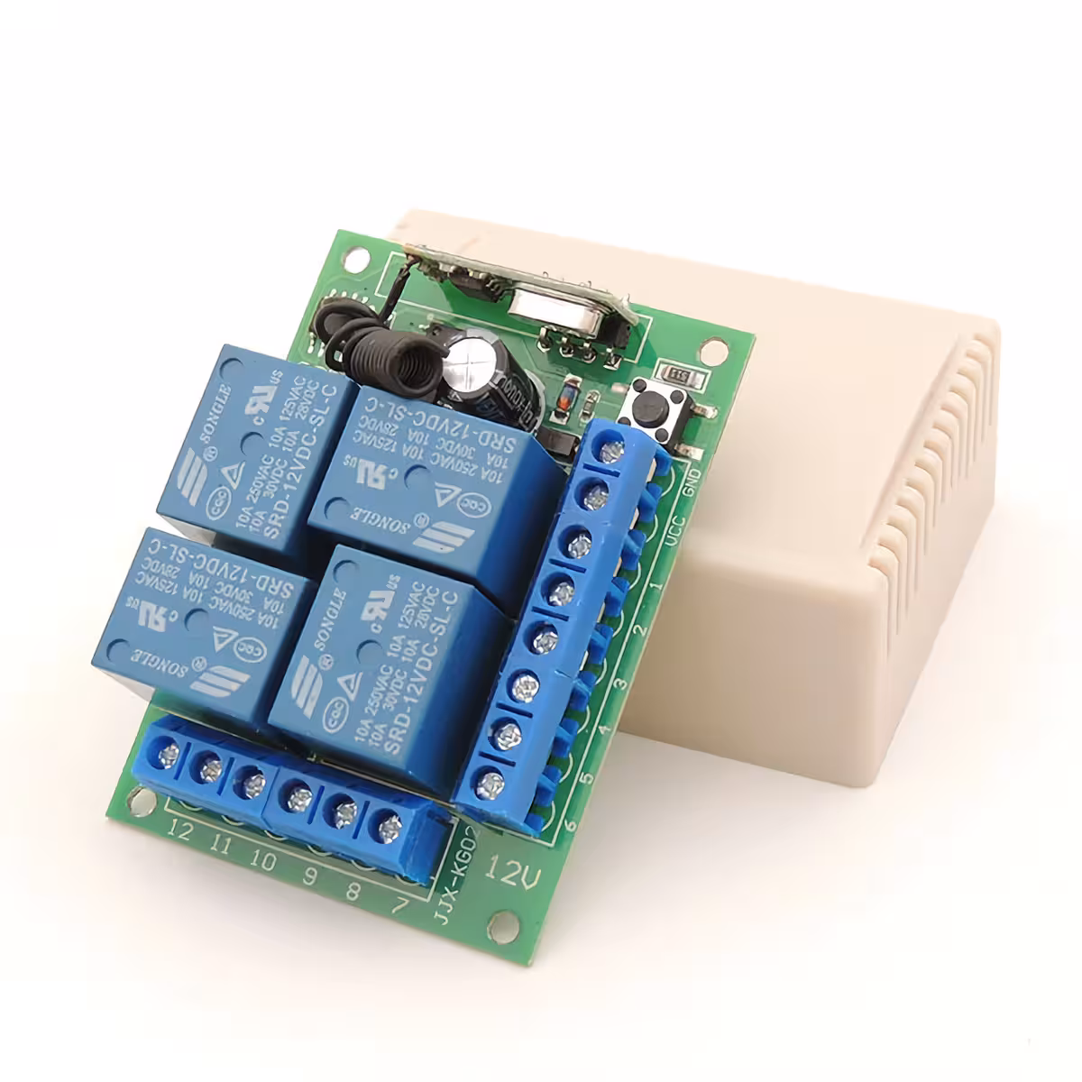 Proizvod uključuje 2 daljinska upravljača i prijemnik s četiri neovisna releja, što omogućuje kontrolu jednog ili više uređaja pomoću daljinskog upravljača.
