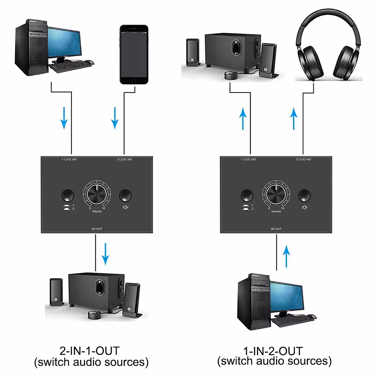 Bidirekcijski audio prekidač 2×1 / 1×2 idealno je rješenje za brzo upravljanje audio signalom između dva izvora ili dva izlaza. Ovaj Audio Switcher kompatibilan je s slušalicama, aktivnim zvučnicima i audio sustavima, omogućujući brzu izmjenu između izvora. Funkcionira kao prekidač za zvučnike, prekidač audio signala i prekidač audio izvora, s RCA splitterom i Jack 3,5 mm za jasan signal, bez gubitka kvalitete.